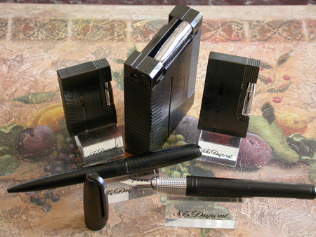 The series included the following items: 2 Table lighters (Jeroboam) in palladium and black PVD-coated Gun metal color, 2 Line 2 lighters (palladium and black PVD-coated Gun metal color) , 2 Gatsby lighters (palladium and black PVD-coated Gun metal color), 2 Fountain pens (palladium and black PVD-coated Gun metal color), 2 Ball pens (palladium and black PVD-coated Gun metal color), 2 Rollerballs (palladium and black PVD-coated Gun metal color), 7 piece collector set, key chains (4 types), cufflinks (bullets and ingots), 2 wallet styles.